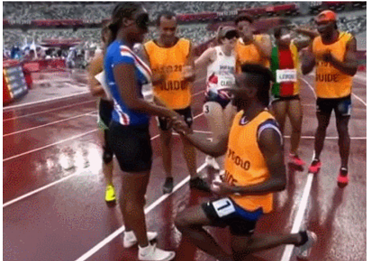 这一幕发生在女子田径T11级赛场,佛得角T11级田径运动员佩雷拉-瑟梅多的引导员瓦兹达维加在200米预赛之后,于跑道上单膝下跪向瑟梅多求婚。瓦兹达维加取出准备好的戒指为瑟梅多戴上,两人紧紧拥抱在一起,而其他参赛选手和引导员围在一边鼓掌祝贺。