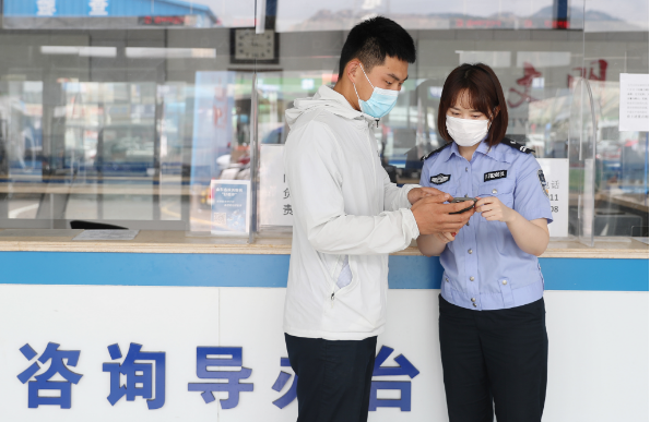 2021年9月1日,青岛经济技术开发区公安局交通警察大队车辆管理所的工作人员在给驾驶员讲解如何网上申领电子驾驶证。人民视觉 图