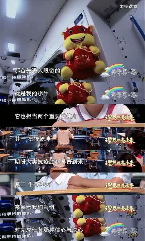 在简单介绍过厨房中的各项装置后,刘伯明带领大家来到了三位航天员的卧室。首先进入眼帘的,是刘伯明卧室门口悬挂的小牛玩偶,它的出现,给严肃的空间站带来了一丝俏皮可爱。“它也担当两个重要的使命,其一是扭转乾坤,期盼人类抗疫胜利早日到来;其二是牛气冲天,来展示我们乘组对完成任务的信心和决心!”刘伯明讲述着小牛的非凡意义。