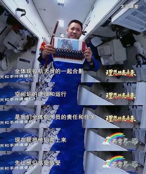 除此之外,三位航天员还向孩子们展示了跟随他们一起进入太空的其他物件。例如,聂海胜的笛子、刘伯明的全家福、汤洪波的全家福以及妻子的手写卡片。