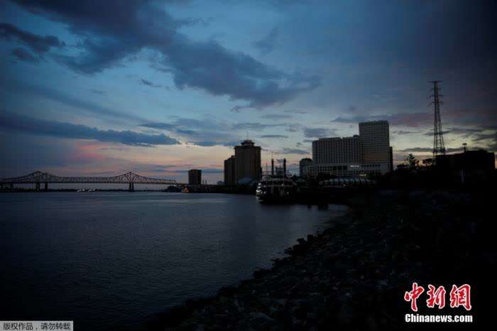 当地时间8月31日,美国路易斯安那州新奥尔良,由于电力尚未恢复,傍晚时分城市街景灯光罕见。