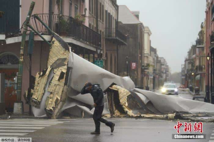 图为当地时间8月29日,美国路易斯安那州新奥尔良市感受到飓风“艾达”的影响,一栋建筑的部分屋顶北掀翻。