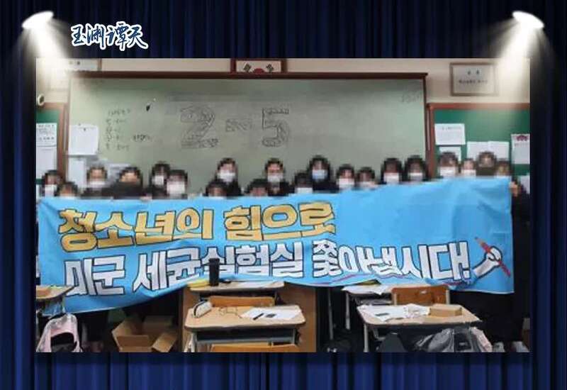 ▲韩国学生举横幅反对美驻韩实验室