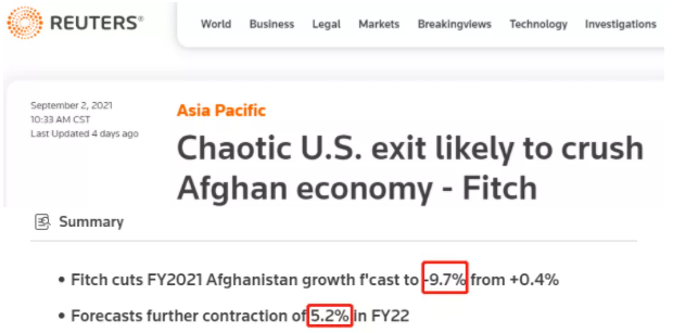 即使在美军仓皇撤出后,阿富汗仍继续因美国的错误而承受着苦难。国际评级机构惠誉发布的最新报告显示,阿富汗的国内生产总值今年可能会萎缩9.7%,明年可能会继续萎缩5.2%。