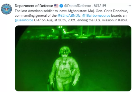 △美国国防部在其社交账号上发布“最后一个撤离阿富汗的美国士兵”的图片。