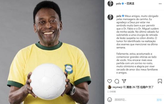 当地时间9月6日下午,巴西著名足球运动员贝利在其社交网络上宣布,由于医生在其体内发现了可疑病变,自己已在医院接受了手术,切除了结肠中的肿瘤。贝利还向关心自己的球迷表示了感谢,并表示将以乐观的心态“踢好这一场比赛”。