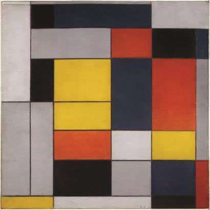 有趣的是,方形稍晚于圆形出现,主要靠两位独行侠。俄国艺术家卡济米尔·马列维奇先声夺人。1913年,蒙德里安还在一点点地摸索着对树的简化,马列维奇在一张白纸上用直尺画上一个正方形,再用铅笔将之均匀涂黑,名为《黑方块》,两年后他把这幅画拿到彼得格勒“最后的未来主义绘画0、10”上展出,观众纷纷叹息,“我们所钟爱的一切都失去了……我们面前,除了一个白底上的黑方块以外一无所有!”马列维奇同时发表“至上主义”宣言,认为在绘画中纯粹感情或感觉至高无上,这种理论比康定斯基的“艺术的精神”决绝得多,他要做的是把绘画的表现性因素彻底排除,难怪早年会被莫斯科绘画雕塑建筑学院三次拒绝了。所幸马列维奇在35岁时顿悟,最简单的形式——方块就是不带任何感情因素的直角系统。40岁时马列维奇又推出了更加极致的《白上白》,白底上一个白方块微微向右倾斜,仿佛要弥散开来,此时不仅体积、深度消失,所谓物体、空间都变得毫无意义。五年间马列维奇似乎让方形走到了尽头,蒙德里安还怎么做呢?蒙德里安直到1917年才简化出三种颜色的方块,刚刚把色块装到大小不同的方格子里,就面临马列维奇这种否定意味的白色沉默,他却是十分坚定又乐观的投入“新造型主义”的抽象,以节奏和韵律的和谐为目标稳扎稳打,1921年他提炼出三原色加三非色、水平线加垂线的网格结构,又坚决的剔除用对角线(与好友决裂),最后成为现在最著名的格子大师。