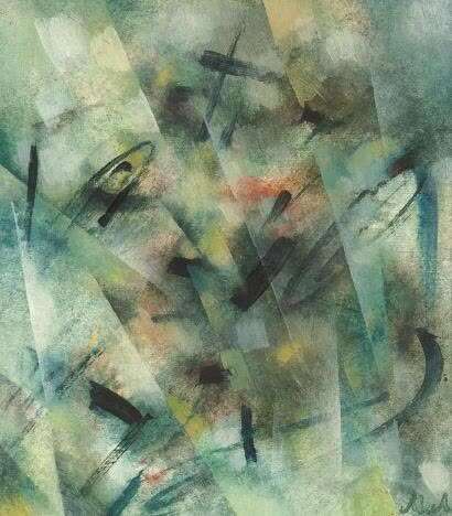 但仅有色彩是不够的,抽象绘画如何调动感官?需要对节奏和韵律的掌控,这正是音乐和舞蹈的强项。康定斯基早就是个业余大提琴手,1911年他听了勋伯格那种音调结构无从捉摸的音乐之后,顿觉遇到知音,开始用色彩即兴创作,画出题为“印象”“即兴”“构图/作曲”的系列作品。他还写信给勋伯格,赞美其无调音乐将音乐简化,去掉主音,让每个音符都同等重要,是为了创造“新的和谐”。1912年,库普卡反复画一种叫做紫穗槐的植物,将之命名为“两种颜色的赋格曲”,诗人纪尧姆·阿波利奈尔以此为范例,请出古希腊的诗歌和音乐之神俄耳甫斯,宣告一种全新的纯粹绘画“俄耳甫斯主义”诞生,那就是用抒情色彩和自由联想造成律动感,使绘画达到音乐般的纯粹情境。同年,喜欢跳舞的富家子弟弗朗西斯·毕卡比亚画了《在春天跳舞II》,不见人形,未来主义者吉诺·塞维里尼也画了《舞者》,意在表现某种动力理论,不自觉地走入半抽象。