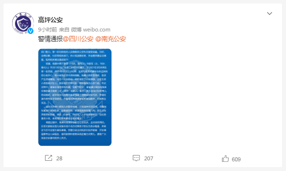 中工网讯 近日,四川南充一段“男子疑似虐婴”的视频引发网友关注。9月7日晚,四川省南充市公安局高坪区分局官方微博“高坪公安”发布警情通报。通报如下: