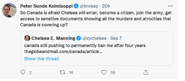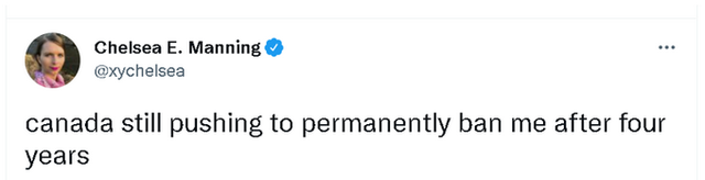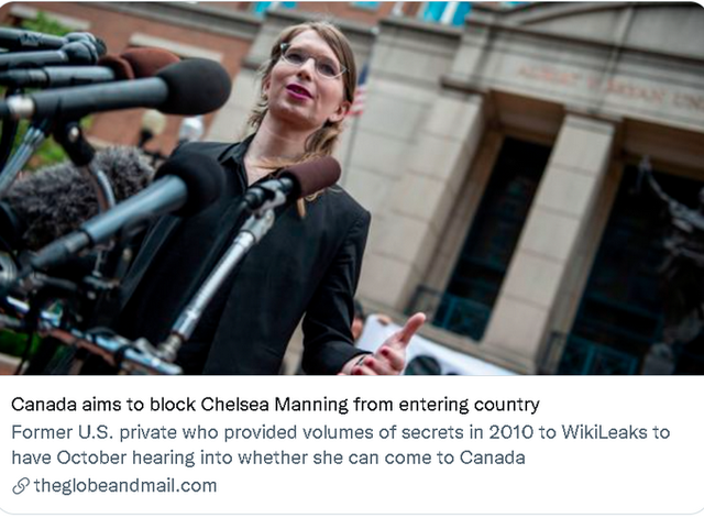 目前,曼宁本人已经在境外的社交网络上抗议了此事。不少她的支持者也在质问为何加拿大要拒绝这么一位揭露了美国战争罪行的“吹哨人”入境,是不是为了取悦美国,或是害怕曼宁再曝出什么对加拿大不利的黑幕信息。