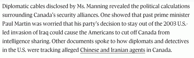 比如在2003年美国选择入侵伊拉克时,时任加拿大总理的保罗·马丁并没有让加拿大军方跟着美军一起前往伊拉克。但曼宁泄露的机密文件显示,马丁当时很害怕此举会遭到美国的报复,不再给加拿大提供情报分享。