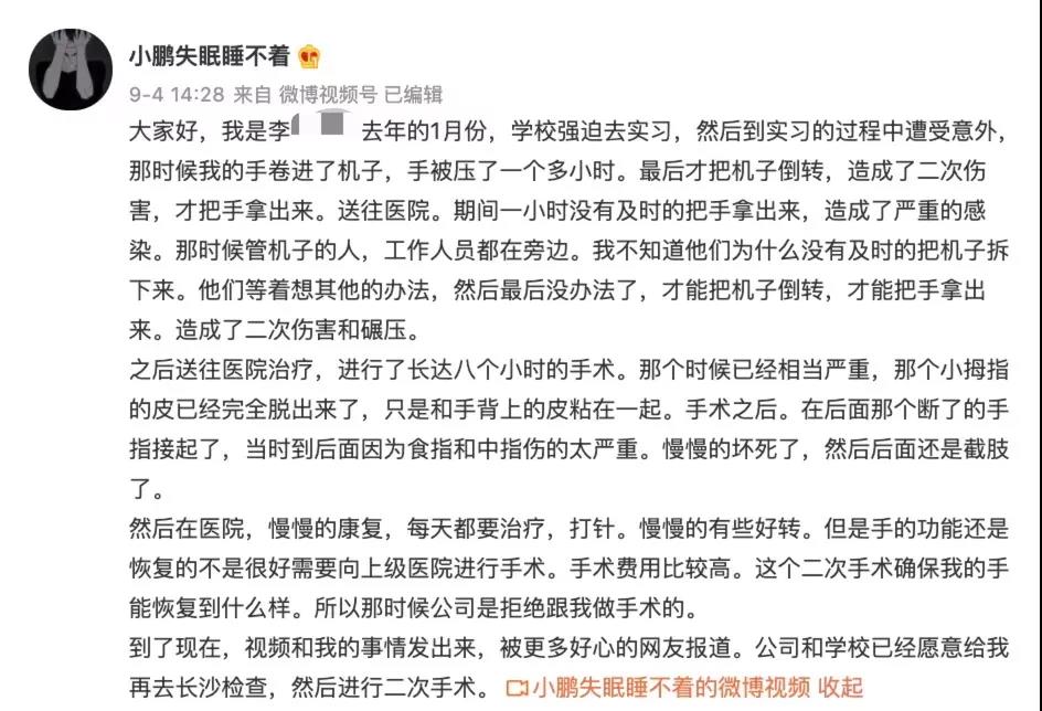 19岁学生被强制实习致残?多方回应