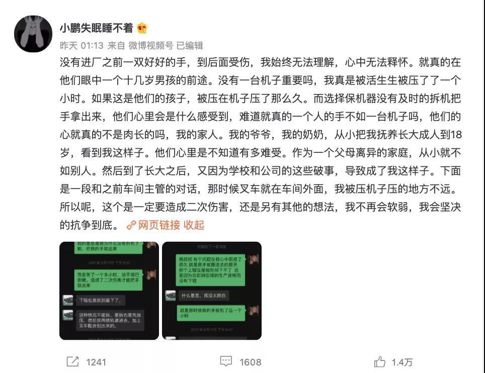事后,面对工厂和学校的推诿,他无奈主动曝光。消息引发热议。