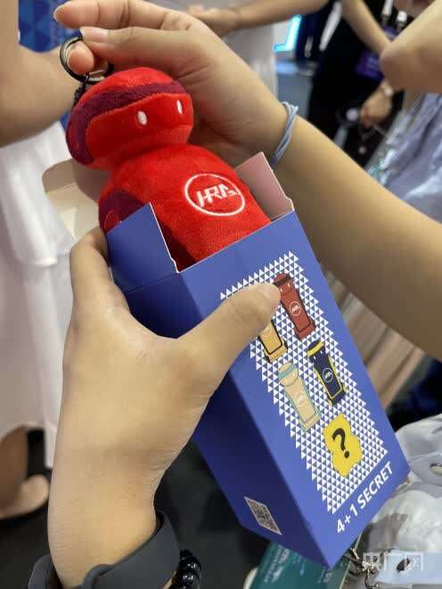 机器人还有盲盒?没错,此次机器人大会有一个展区前大排长龙,参观者为抽取盲盒排起了长队。这是哈工大机器人集团精心设计的小环节,将机器人纪念品以盲盒的形式派送给现场观众。