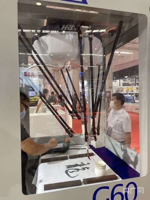 同时在哈工大机器人集团展区,这个用毛笔写字的机器人也吸引了人群的目光。这是哈工大机器人集团打造的轻巧型并联共融机器人,由于具备轻巧灵活的特性,它甚至可以写出游云惊龙的书法作品,令人拍案叫绝。这种机器人其实主要应用于工厂中搽胶、打磨等工艺环节,目前已在制鞋业投入使用。据哈工大机器人集团股份有限公司执行总裁王洪波介绍,此前国家和产业界人士关注比较多的还是集中在核心零部件,但现在随着机器人产业的发展,越来越多关注感知和通讯层面,对机器人的要求也越来越高。王洪波认为关注机器人产业,未来可能要更多地关注产业链的上游。