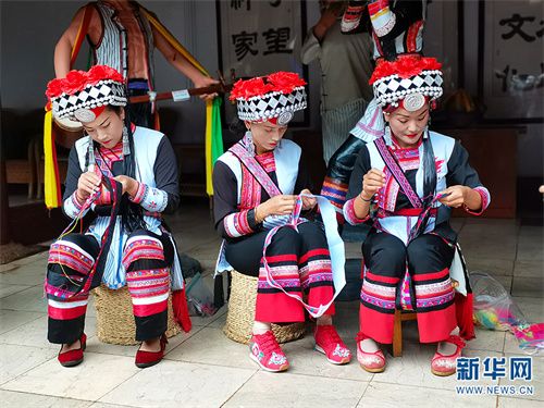 红河弥勒可邑小镇“阿细跳月”非遗传习点,身着传统民族服装的村民们正在进行刺绣(7月23日摄)。新华网 冯雨钐 摄