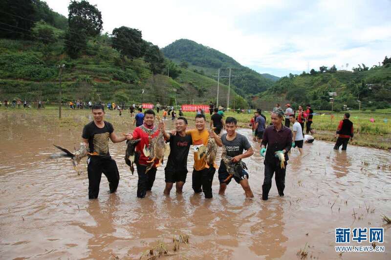 普洱景东太忠嘎仰丰收节捉鸭子比赛(2019年9月22日摄)。新华网发(李茜 摄)