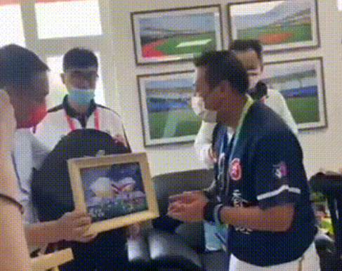 而在早先举行的棒球比赛中,香港队在结束所有比赛后收到了赛事举办地西安市鄠邑区赠送的礼物——由当地农民画家绘制的陕西文化特产:户县农民画。几名队员爱不释手,捧起画对着相机比起了“耶”。