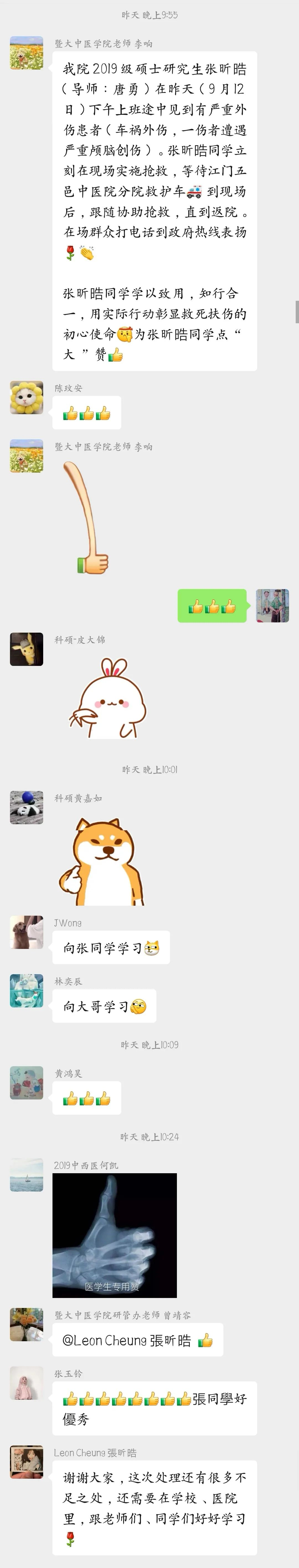 大家这才知道,原来在路边救助伤者的医生,是来自暨南大学中医学院2019级的一名硕士研究生。13日晚上,消息传回学校,张昕皓所在学院的微信群的响个不停,全是老师、同学们对自己白天救助伤者事迹的点赞和表扬。