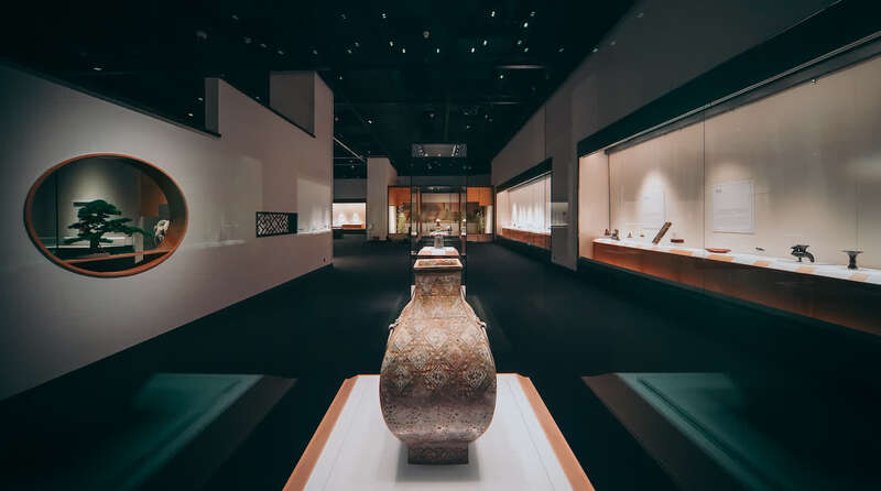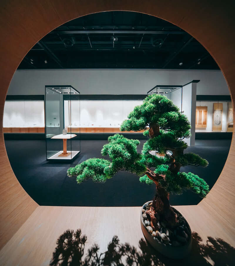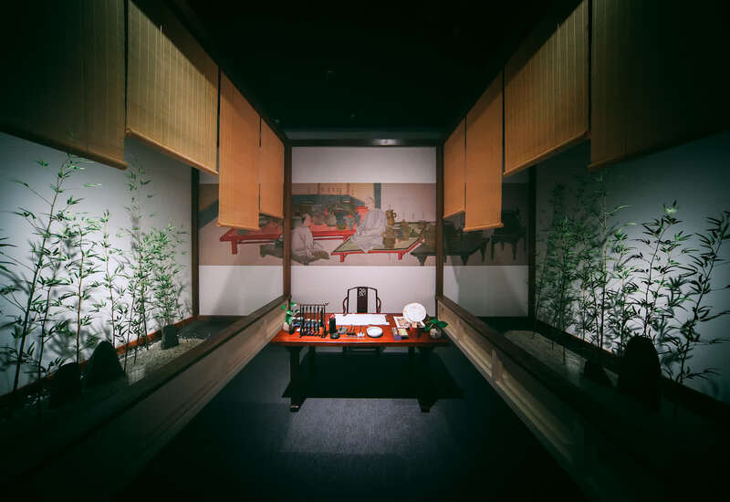 为配合展览主题,营造文人生活意境,此次展览提炼了传统古建和装饰纹样的元素,借鉴江南园林造景之法,复原了古代文人书房、亭台等场景,更有一隅小园错落其间。步入展厅,观众穿梭在白墙黛瓦之间,竹影徐徐,叠石参差,相映成趣。