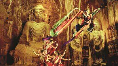 舞作《龙门金刚》,以实景重现的方式将环境选定在洛阳龙门石窟奉先寺中,飞天、金刚力士等形象与现实的舞者“同台演绎”,营造出跨越时空的现场感。舞作的创意解决了长期以来壁画姿态如何动、飞天形象如何“飞”的问题。当下的舞台实践,无论是翻飞回旋的绸花,还是抻曲旋拧的动势,其核心旨在营造满壁风动、若翔若行的轻盈、腾飞之感。但受限于四方舞台的表演空间,“飞”的质感往往只存在于动作的瞬间,而借助镜头语言、威亚特技等手段,使得迎风飞翔之感得以贯穿始终,搭绸与腾空而起的镜头顺接突破了身体运动力学上的极限,在视觉上给人以轻盈、腾跃之感。