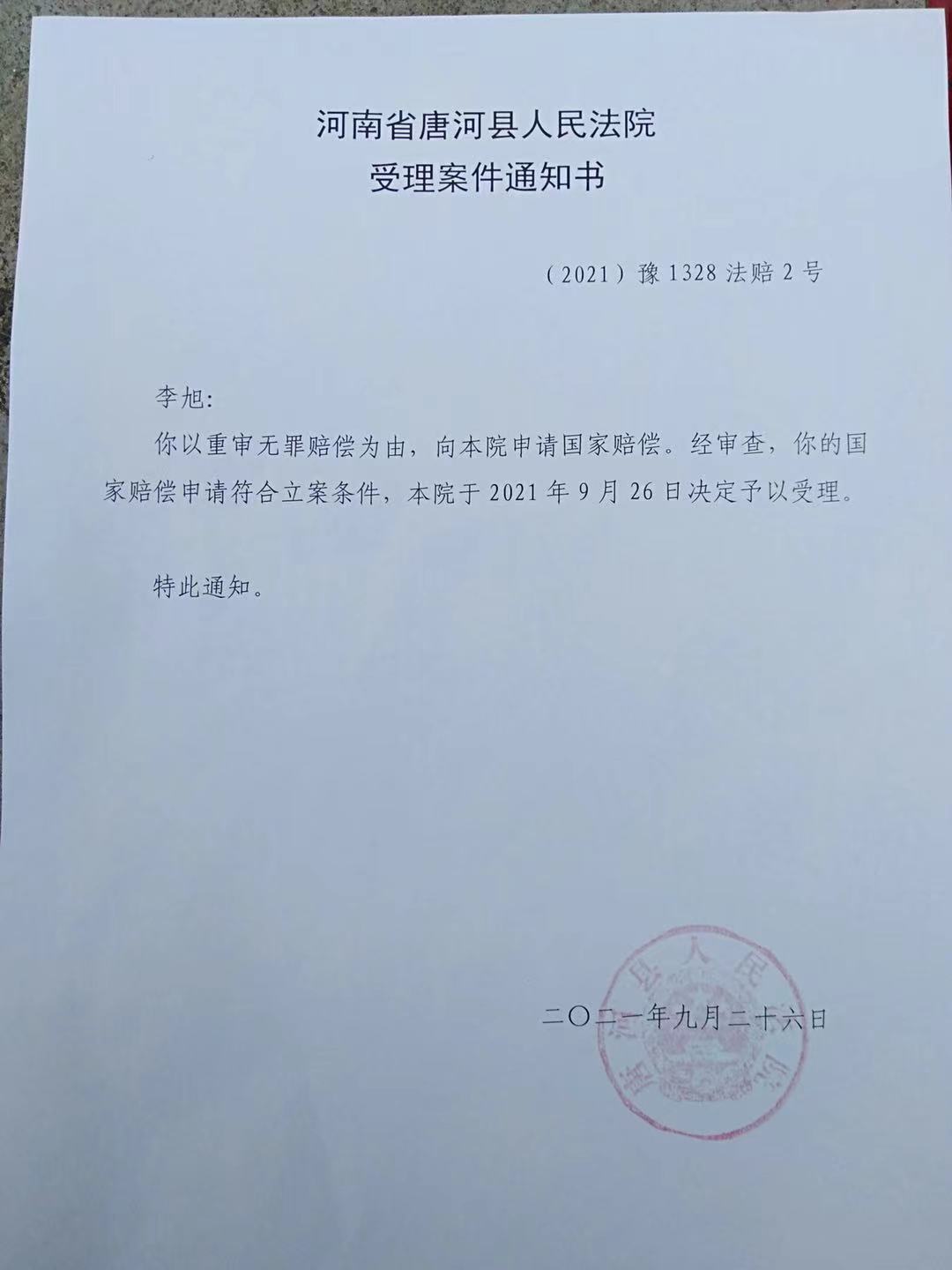 唐河县法院一日前作出的案件受理通知书显示,经审查,三人的国家赔偿申请符合立案条件,决定予以受理。