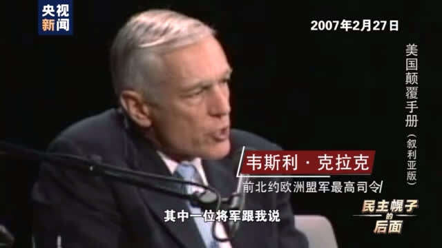 前北约欧洲盟军最高司令 韦斯利·克拉克:(2001年)“9·11”事件发生十天后,我去了一趟五角大楼,我下楼去和联合参谋部的人打招呼,这些人曾经和我一起工作,其中一位将军跟我说,我们决定要与伊拉克开战,这大概是(2001年)9月20日的事,我说要和伊拉克开战,为什么呀?他说,我也不知道啊,他说,我估计是他们不知道还有什么别的可做的。