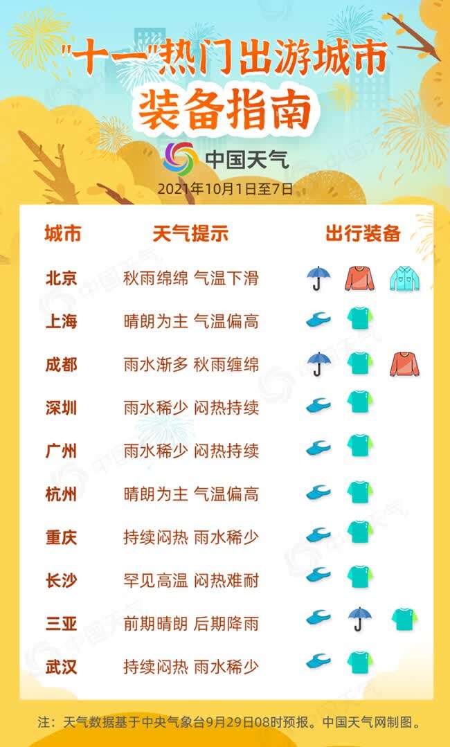盼望着,盼望着,十一假期终于近在咫尺,大家是不是已经按捺不住激动的心情?但这个假期天气有点复杂,北方天气多变降雨降温,南方高温炎热同期少见。中国天气网推出“十一”假期全国天气地图,还有十大热门出游城市装备指南,大家出行前需关注天气情况,有备无患才能更好享受假期。