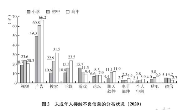 从不良信息的接触渠道来看,广告是为所有年龄层的未成年人带来最大风险的主要来源,占比最高,亟待相关部门制定、实施更加严格的监管机制来帮助广大未成年人在碎片化植入的广告洪流中有效规避不良信息干扰。