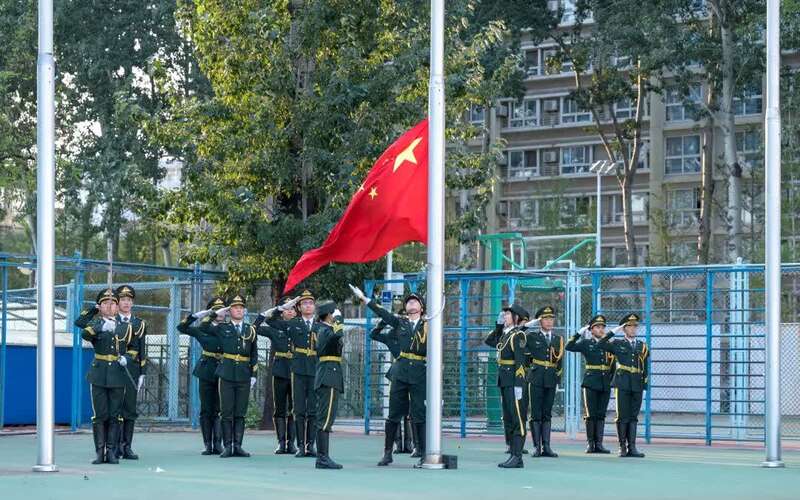 今晨7点,北京航空航天大学校园里,五星红旗伴随着雄壮的国歌声冉冉升起,同学们共同祝福伟大祖国繁荣富强。张可立摄