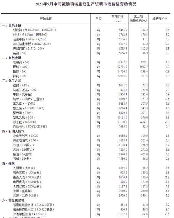 国家统计局发布的2021年9月中旬流通领域重要生产资料市场价格变动情况显示,螺纹钢、线材、铝锭、硫酸、烧碱(液碱)、甲醇、苯乙烯、聚乙烯、聚丙烯、水泥等价格环比上涨。