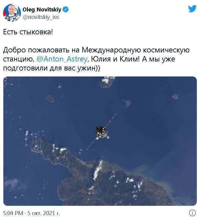 在空间站上等候的俄罗斯宇航员奥列格·诺维茨基在“联盟MS-19”号载人飞船和空间站成功对接后在社交媒体发文称,“对接成功!安东、尤利娅和克利姆,欢迎来到国际空间站,我们已经为你们准备好了晚餐!”