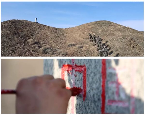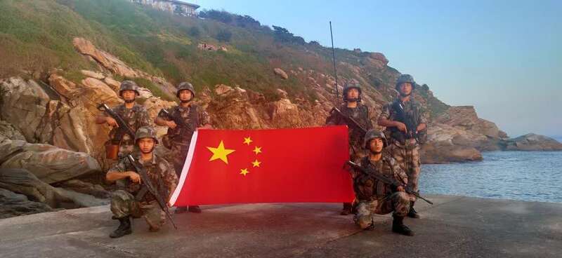 经过艰难跋涉,巡逻小分队登上阵地,官兵们展开五星红旗,在巡逻一线,用海防军人特殊的方式,向祖国祝福。