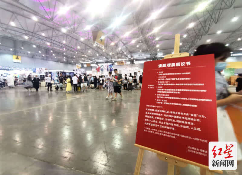 在现场,记者注意到,整个展会外围、现场摊位、舞台、志愿者配饰等都有着相关标语挂幅,明显地提示着清朗·展会的氛围风气。与此同时,特意制作的清朗宣传视频特辑在现场各大舞台屏幕的空隙空间轮流滚动播放,让参展的小伙伴从视觉听觉上都能感受到“清朗”的重量,感受到一片干净、纯洁的展会氛围。