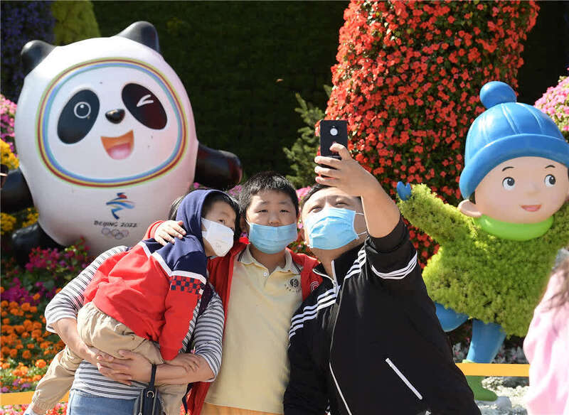 10月1日,人们在北京长安街西单路口“喜迎冬奥”主题花坛前拍照留影。新华社记者 李贺 摄