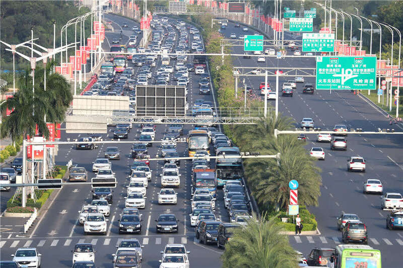这是10月6日拍摄的广西南宁市民族大道进城方向车流。新华社记者 周华 摄