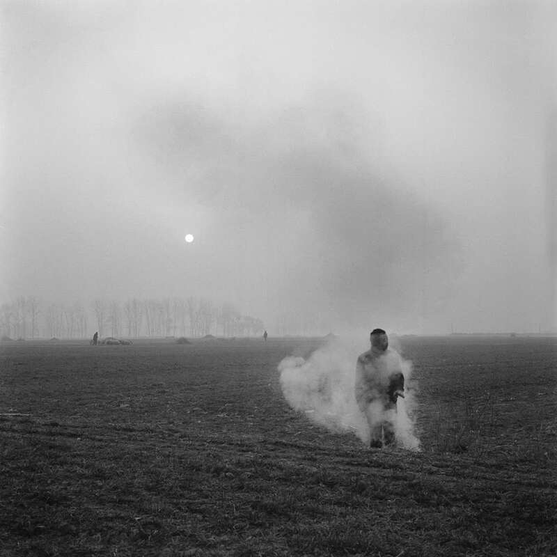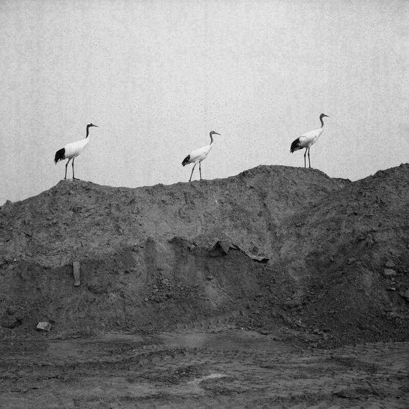 严明的照片有一种神奇的化动为静的本领,严明在2019年在东北齐齐哈尔自然保护区看到了仙鹤,“它们白天被放飞,正好边上是一个工地的土渣,我拍到了这个形象。我想讲的是,有一些神奇的场景,就是一种馈赠,仙鹤这种仙鸟落在相纸上,大家可以看到照片上面充满了斑点,其实就是胶卷发霉了,我后来觉得它像花的墙纸,有一点沧桑和神秘感。”这张照片中,三只仙鹤像是泥塑一般静止和有重量感。