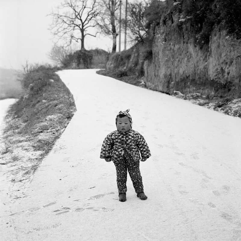 这本书封面的这张照片中,当时村里下雪,大家都出来打扫,这个小孩爸爸也在,小孩在路边的一个弯道上,他的个头足够小,不然头部会顶到路上面,画面太满,而他穿的棉衣让他显得圆圆的,生活里常常越小的人,在画面中越合适。