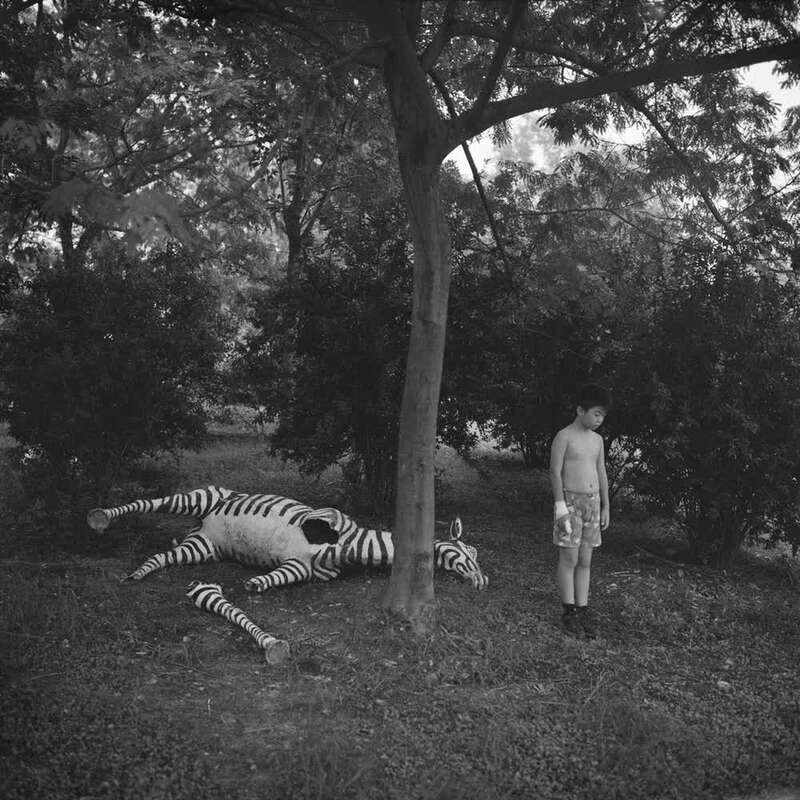 严明所关注的“山河故人”中,也有自己的家人。《长皱了的小孩》一书的封面曾用过一张儿子严亨骑着一匹塑料斑马的照片。严明在书中回忆了这张照片的拍摄:“三四年前的暑期,我带儿子回去,我妈跟我说起父亲被查出病时,他的状态还行,仍是平常的样子。就是在带孙子在家附近溜达的时候时常觉得累,需要坐下来休息。那时候只是觉得他渐渐衰老,内里出了问题会导致将来怎样,没有预料。……2012年,我拍过一张照片《严亨与斑马》,就是在我家旁边的公园里拍的。我预先看中了那个场景和傍晩的天光,记下了时间,第二天傍晩便带上儿子去给我做模特。照片并无多大意义,只是想让他留下跟这个小县城老家的联系而已。父亲也跟了去,我交代他替我一直举着一只小小手电筒作为灯光,他就一直勤勤恳恳地举着。这也是唯一的一张父亲给我当助手的照片,不难看出右侧有一道很有方向性的光源的存在。”