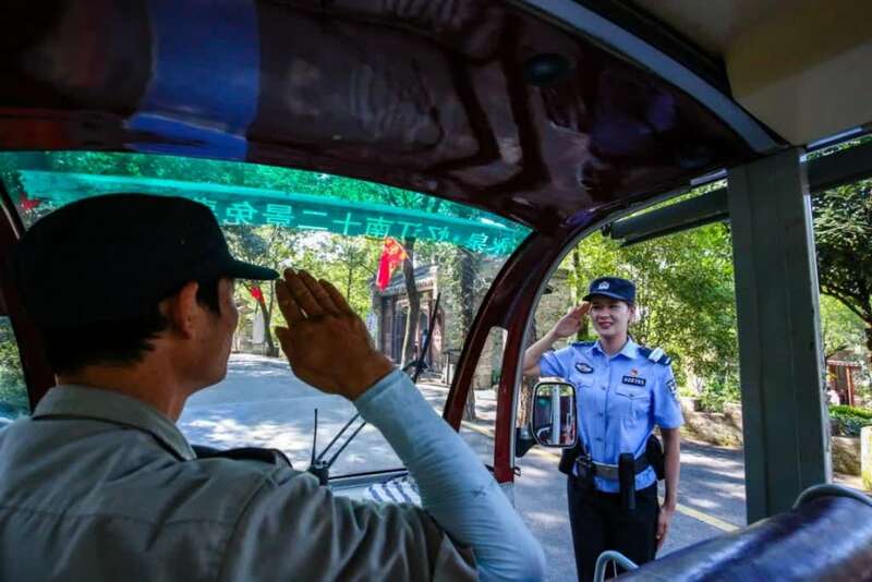 景区一名安保人员开车从尹华飞身边路过时,特地停下车,用着标准的敬礼手势对着尹华飞说:“你们辛苦了!”