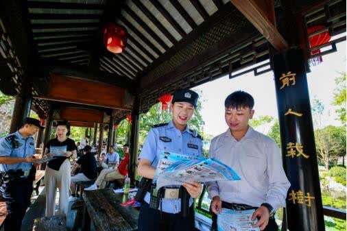 10月2日,在当地永泉农庄旅游度假区,尹华飞和辖区派出所民警一起执勤巡逻,开展反电诈宣传。