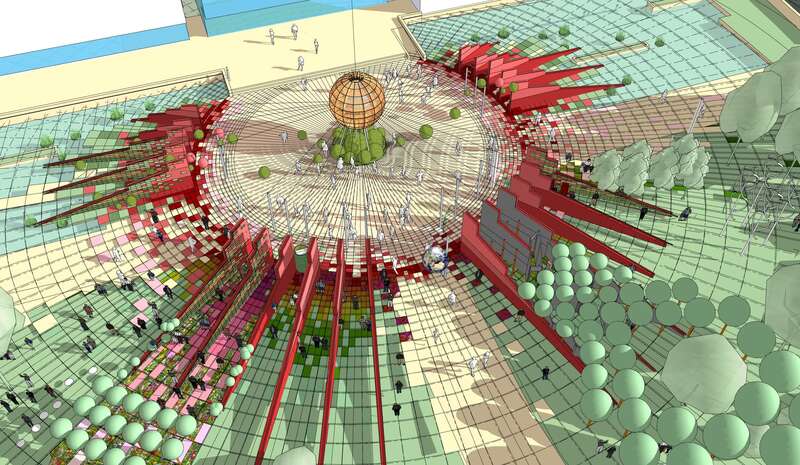 “未来城市花园”以太阳广场为中心,向四周延伸。劳里·切特伍德根据“马斯洛需求层次理论”的生理需求设计了食物花园、水上花园、空气花园、睡眠花园和居所花园。食物花园利用城市空间种植食物,水上花园建立雨水收集系统,空气花园展示多种空气净化植物,睡眠花园用芳香植物疗愈人心,居所花园则用天然材料建造栖息地。