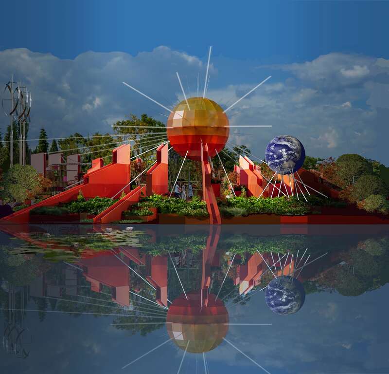 在创作“未来城市花园”时,切特伍德希望呈现一个人与自然、城市与乡村和谐共处的理想花园,营造一个可持续发展的未来生态世界。“未来城市花园”中有一个巨大的太阳模型,其内部设有氢能源燃料电池,为包括五个花园在内的整个装置提供动能。自“太阳”辐射而出的每一个花园,也都体现了生物多样性的环保理念:食物花园不仅为人类而建,也在强调动物和昆虫的觅食需求;水上花园所呈现的水资源储备,为昆虫和野生动物提供了栖息地;居所花园使用天然材料建造昆虫旅馆,也有供人类避雨的雕塑。