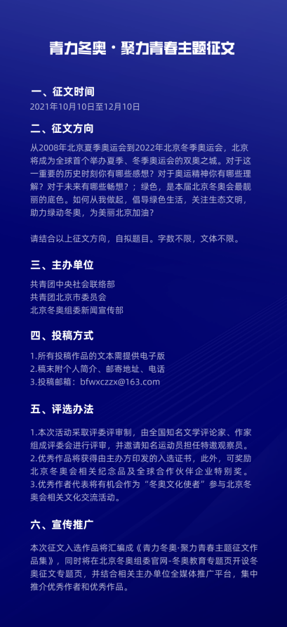 中国青年报客户端讯(中青报·中青网记者 梁 璇)由共青团中央社会联络部、共青团北京市委员会、北京冬奥组委新闻宣传部联合主办的“青力冬奥·聚力青春”主题征文活动于10月10日正式启动。