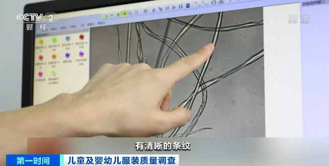 记者了解到,检测发现的不合格项目当中,有一个项目决定了纺织产品性能特点,直接影响着儿童及婴幼儿的舒适体验,这就是童装的纤维含量。检测发现标注是百分百棉的,可能里面掺杂了大量的化学纤维,标注棉为主要材质的实际上含量也达不到,像这款产品标签标注是百分百棉,可是在显微镜下却出现了两种纤维形态。