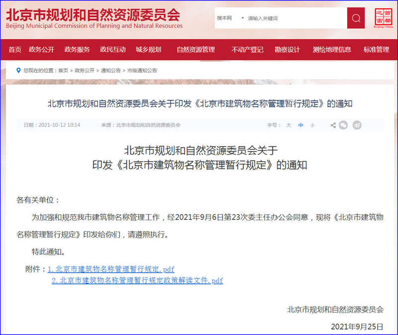 中工网讯 10月12日,北京市规划和自然资源委员会官方网站发布《北京市建筑物名称管理暂行规定》(以下简称《规定》)。《规定》适用于北京市行政区域内建筑物的命名、更名、使用、标志设置及相关管理活动,明确提出建筑物名称应避免使用“大、洋、怪、重”等不规范名称。