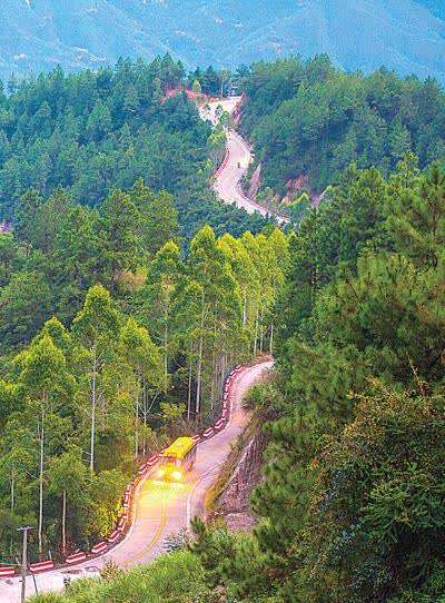公交车行驶在军营村的山路上。何东方摄(人民视觉)