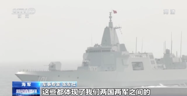 海军军事专家 张军社:我们首次组织多种新型的武器装备来进行实际使用武器训练。像我们的这个南昌舰。展示了我们的这个最新型的在役的装备。那么在这个演习中,无论是这个反潜演习、联合防空演习,我们之间装备的性能,都是向对方开放的。这些都体现了我们两国两军之间的这种高水平的战略互信。