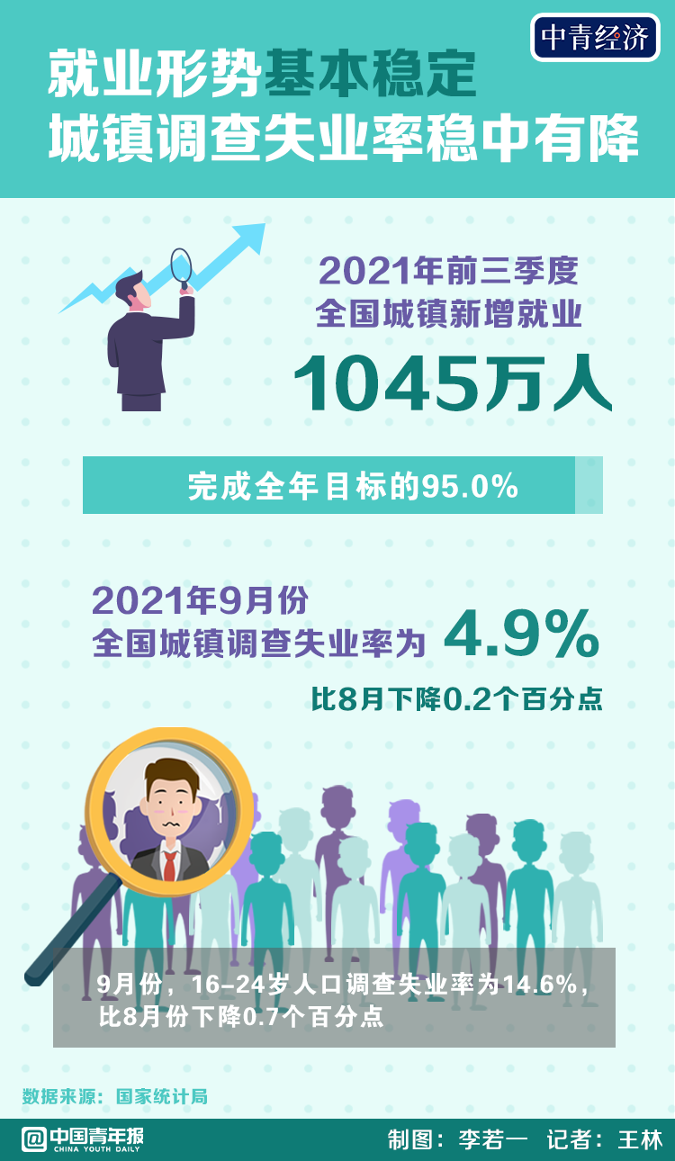 中国青年报客户端北京10月18日电(中青报·中青网记者 王林)国家统计局刚刚公布的数据显示,前三季度全国城镇新增就业1045万人,已完成全年目标的95.0%。国家统计局新闻发言人、国民经济综合统计司司长付凌晖表示,大学生、农民工等重点群体的就业得到改善,带动城镇调查失业率稳中有降。