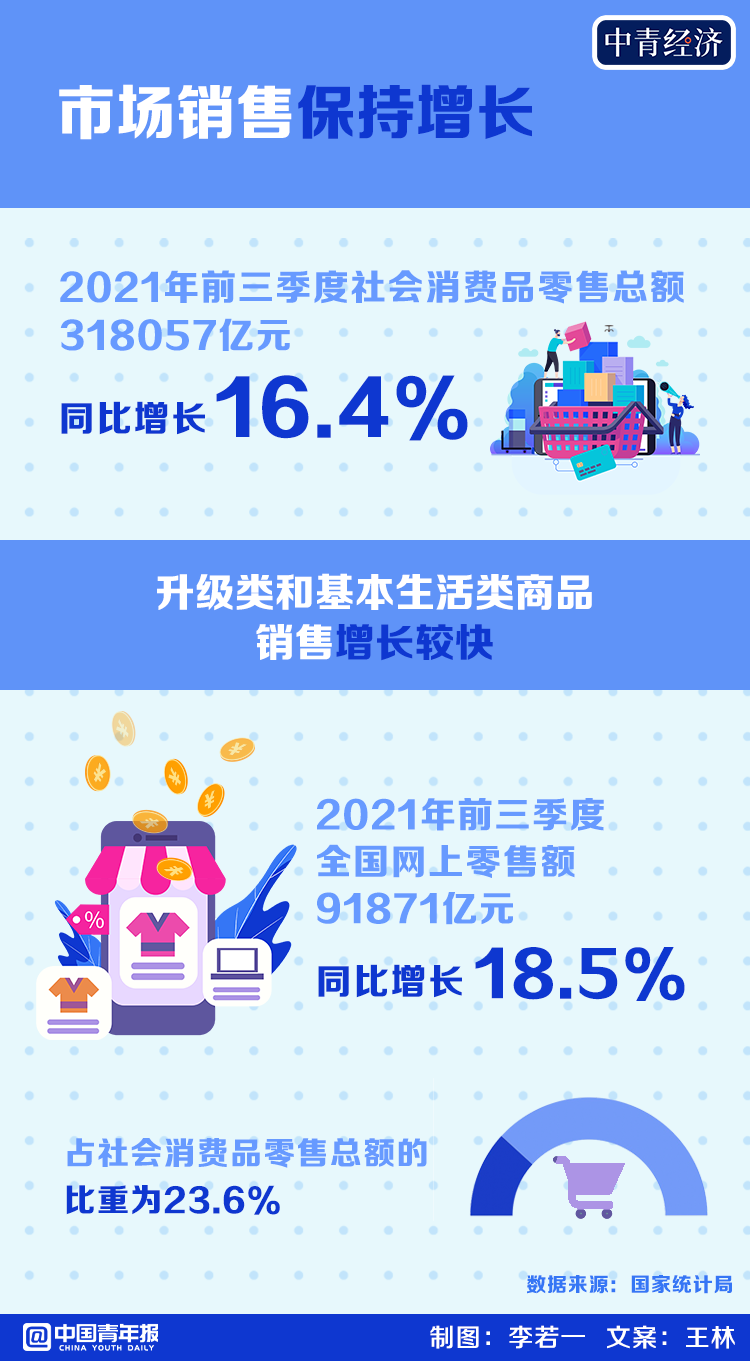 国家统计局公布的数据显示,前三季度市场销售保持增长,社会消费品零售总额318057亿元,同比增长16.4%,升级类和基本生活类商品销售增长较快,网上零售额同比增长18.5%。